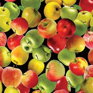 Cider House - Apple Picking. Apples on a black background from Benartex. 14616-99